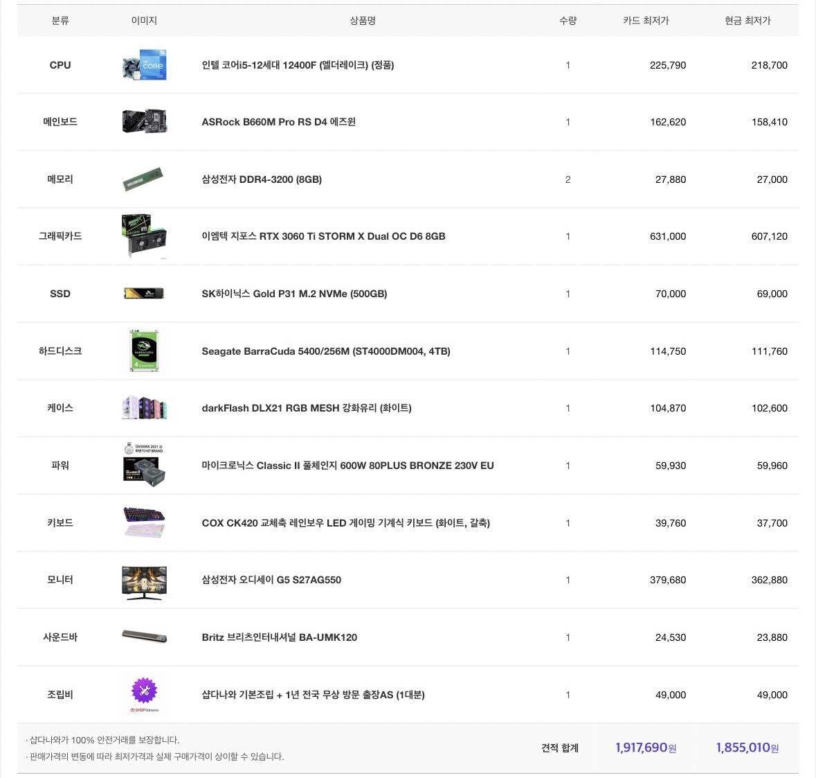 오늘은 LOL, FIFA온라인, 오버 워치 2, 로스트 아크, 배틀 그라운드···..등 인터넷 카페 인기 랭킹 10위 내의 모든 게임을 풀 옵션에서 즐길 수 있는 컴퓨터의 견적을 소개합니다.주말을 맞아 남녀 커플들이 우리의 아이파 크모ー루죠잉스콤 매장 방문하셨습니다. 주로 배틀 그라운드와 로스트 아크를 즐기고 있는 것으로 인기 있는 버그 컴퓨터 사양으로 추천하고 집의 인테리어에 잘 어울리는 화이트 색 케이스를 뽑아 가셨대요. 현 시점에서 가장 인기 있는 인텔 제12세대 i5-12400F프로세서와 GeForceRTX30508GB의 조합이어서 대부분의 인기 게임을 쾌적하게 즐길 수 있는 성능입니다. 그럼 하나씩 개별 부품을 소개합니다. ~부품 소개