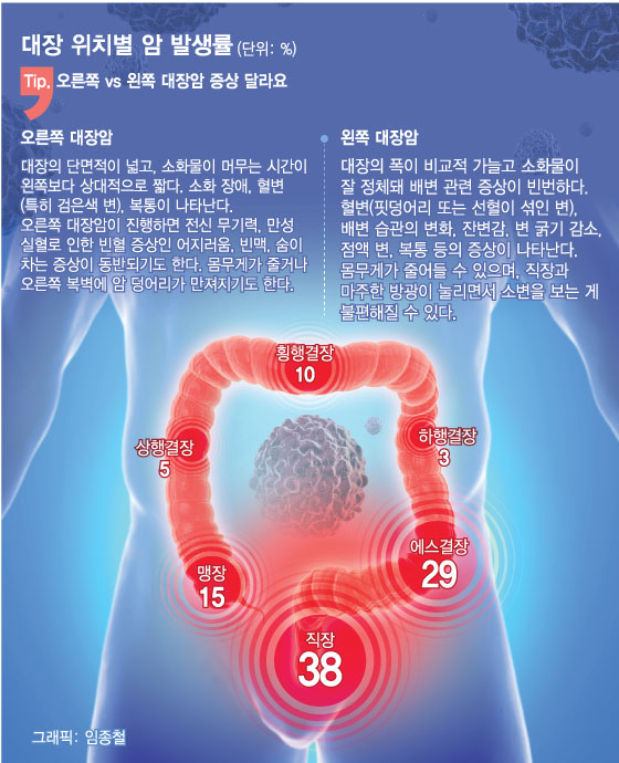 대장 암과 위암의 비교 서양과 달리 한국은 원래 위암이 대장 암보다 많았지만 최근 들어 식사 습관, 문화, 생활 수준이 서구화하는 높아지면서 대장 암 발병률이 급격히 늘어나는 추세입니다.어떤 사람은 대장 암을 부자 병이라고 부르는 것도 있지만..인스턴트 식품, 가공 식품, 술, 폭식, 야식 등과 관계가 있기 때문입니다!▣ 대장 암의 위험률이 높은 사람.① 과거에 선종이나 염증성 대장 질환을 앓았던 사람, ② 가족 중에 선종 환자, 대장 암 환자가 있을 경우 ③ 가족 중에서 대장에 폴립이 발견된 사람이 있을 경우 ④ 평소 기름진 음식은 많이 먹고 채소류(식물 섬유)은 적게 먹는 사람, ⑤ 유방 암, 난소암, 자궁 내막암을 앓은 적이 있는 경우.▣ 초기 대장 암의 의심 증상.① 평소와 다르게 변비나 설사가 꽤 오래 돼서 ② 배가 잘 아프다, ③ 대변의 굵기가 계산하고, ④ 대변에 검붉은 피가 섞여서 나온 ⑤ 잔편감이 항상 있어 ⑥ 체중 감소, 식욕 감퇴, 원인 불명으로 빈혈이 있다.▣ 위암의 초기 증상.초기에는 특별 증상이 없었지만, 점차 ① 속쓰림, ② 소화 장애, ③ 구토, ④상 복부 불쾌감, ⑤ 복통, ⑥ 식욕 저하, ⑦ 가끔 구역질 등.