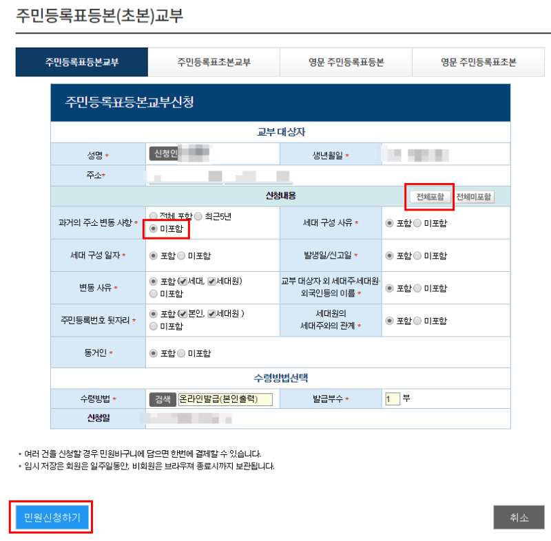 이 페이지에서 초안/등본을 선택해야 합니다. 주소, 발급형태, 수령방법을 선택한 후 민원신청 버튼을 클릭하여 온라인발급(본인출력)을 하고 프린터로 출력할 수 있습니다