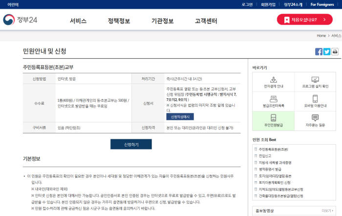 기본적으로 주민등록등본이나 초본을 발급할 때 수수료는 400원이 발생하지만 정부24온라인을 통해 발급하면 무료로 진행됩니다.